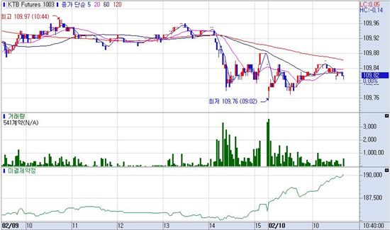 10일 오전 10시40분 현재 3년 국채선물 미결제량이 전일대비 4111계약 늘어 19만136계약을 기록중이다. 같은시간 3월만기 3년물 국채선물은 전장대비 3틱 하락한 109.82로 거래중이다. 이날 국채선물은 7틱 떨어진 109.78로 개장했다.