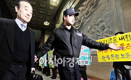 [아시아경제 윤동주 기자] 11일 오전 서울 중구 남대문로 한국은행 본관에서 열린 금융통화위원회의에 참석하는 허경욱 기획재정부 1차관을 한국은행 노동조합원들이 막아서자 보안요원의 호위속에 회의장으로 들어서고 있다.