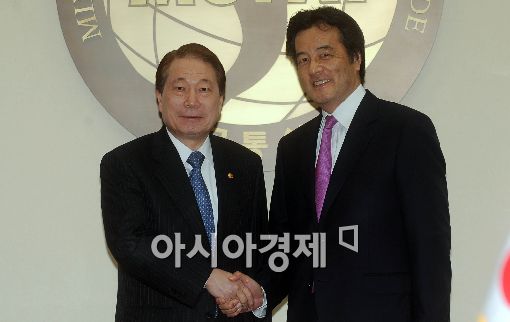 [아시아경제 이재문 기자] 유명환 외교통상부 장관과 오카다 카츠야 일본 외상이 11일 오전 서울 도렴동 외교통상부에서 열린 외교장관회담에서 인사를 나누고 있다.