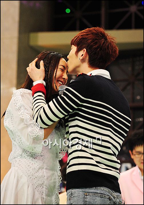 [아시아경제 박성기 기자]가수 바다와 2AM의 조권이 서울 등촌동 SBS 공개홀에서 진행된 '용구라환의 빅매치' 녹화 현장에서 입맞춤을 하고 있다.