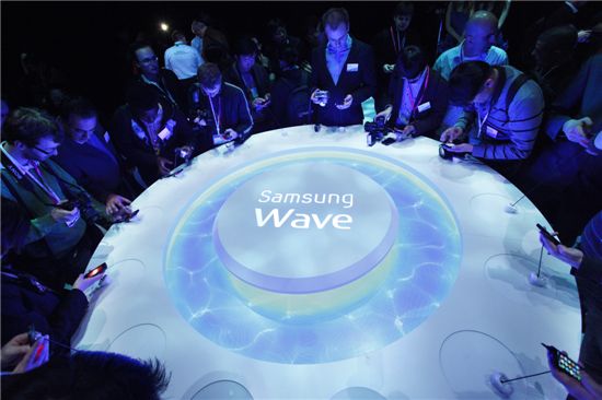 [아시아경제 조성훈 기자] 세계 최대정보통신전시회인 '모바일 월드 콩그레스(MWC) 2010' 개막을 하루 앞둔 14일(현지시간) 스페인 바르셀로나에서 열린 '삼성 모바일 언팩(Samsung Mobile Unpaked)' 행사장에 세계 각국의 모바일 업계 관계자와 내외신 미디어들이 운집해 삼성의 첫 독자 스마트폰 '웨이브(S8500)' 시연을 지켜보고 있다.