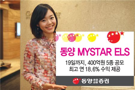 [아시아경제 임철영 기자]동양종합금융증권은 17일부터 19일까지 사흘간 원금보장형 및 조기상환형 파생결합증권인 ‘동양 MYSTAR ELS’ 5종(497~501호)을 총 400억원 규모로 공모한다.