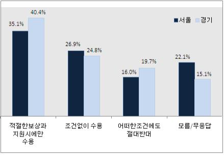 또 적절한 보상과 지원시에만 수용한다는 의견도 서울시민 35.1%, 경기도민 40.4%로 나타났다.
