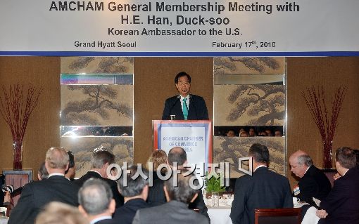 [아시아경제 이재문 기자] 한덕수 주미대사가 17일 서울 그랜드하얏트호텔에서 열린 주한미국상공회의소 초청 강연에서 한미 동맹관계와 한미 자유무역협정(FTA)의 중요성을 강조하고 있다