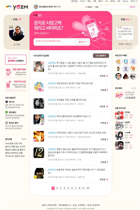 다음커뮤니케이션은 150자의 짧은 글로 웹, 모바일 등에서 빠르고 가볍게 친구들과 이야기를 나눌 수 있는 마이크로 블로그 서비스 '요즘(yozm.daum.net)'을 오픈했다고 18일 밝혔다.