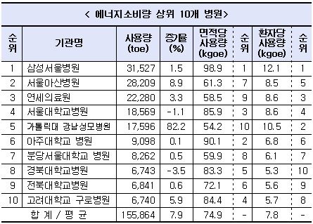 특히 삼성서울병원은 상위 10개 병원 전체 에너지사용량의 5분의 1인 3만1527toe로 1위를 기록했으며 면적당 사용량, 환자당 사용량 모두 1위에 올랐다. 상위 10개 병원의 면적당 에너지사용량 평균은 74.9kgoe/㎡로 상업용 건물 평균(35.6kgoe/㎡)에 비해 2배 이상 높은 것으로 나타났다.