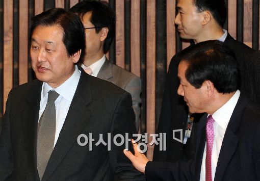 [아시아경제 이재문 기자] 세종시 당론 변경 문제를 논의하기 위해 22일 오후 국회 예결위회의장에서 한나라당 의원총회가 열린 가운데 친박계 유정복 의원과 김무성 의원이 이야기를 나누고 있다.