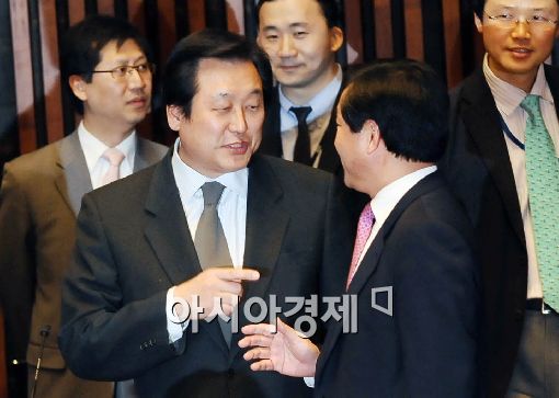 [아시아경제 이재문 기자] 세종시 당론 변경 문제를 논의하기 위해 22일 오후 국회 예결위회의장에서 한나라당 의원총회가 열린 가운데 친박계 유정복 의원과 김무성 의원이 이야기를 나누고 있다.