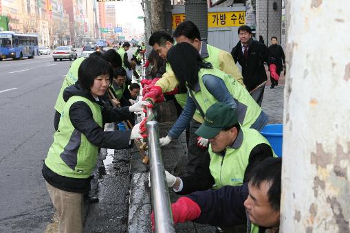 또 겨울동안 물청소를 하지 못해 대기 중 미세먼지 농도가 매우 높아 주민 건강에 위해요소가 될 우려가 있던 터라 참가자들이 직접 양동이로 물을 떠 스펀지, 물걸레 등으로 가드레일과 쓰레기통 등에 쌓인 먼지와 얼룩을 지운다.