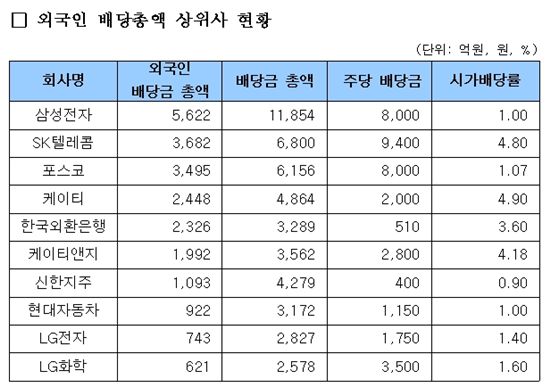 삼성전자는 올해 1조1854억원 현금배당 중 외국인 배당금이 5622억원 규모에 달한다. SK텔레콤과 포스코의 외국인 배당금도 각각 3682억원과 3495억원 수준이다.