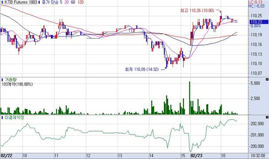 같은시간 국채선물은 전일대비 9틱 올라 110.23을 기록하고 있다. 이날 국채선물은 2틱 오른 110.16에 개장했다. 은행이 2982계약을 외국인이 1453계약을 순매수하고 있다. 반면 보험이 1823계약 순매도세다. 투신과 증권도 각각 1230계약과 653계약을 순매도중이다.