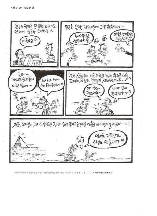 [아시아경제 김진우 기자]공정거래위원회는 졸업 및 입학 시기를 맞아 사회경험이 부족한 대학생들에 대해 불법다단계 피해를 예방하기 위해 '다단계판매 피해예방요령, 홍보만화' 등을 대학 교육관련 기관 등에 배포했다고 23일 밝혔다.