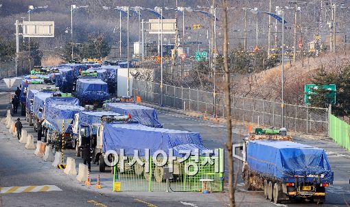 [아시아경제 이재문 기자]정부가 신종인플루엔자 관련 대북 지원의 일환으로 10억원 상당의 손 소독제를 북한에 보낸다. 23일 오전 경기도 도라산 남북출입국사무소에서 총 20만ℓ 25t 트럭 25대에 분량의 신종플루예방 손소독제를 실은 트럭들이 북으로 향하고 있다.