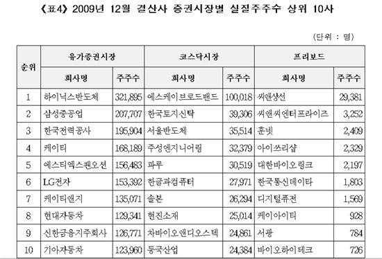 하이닉스는 실질 주주수가 가장 많아 32만2000여명의 주인을 둔 것으로 나타났고 삼성중공업, 한국전력, KT 등이 뒤를 이었다. 코스닥 시장에서는 SK브로드밴드의 주주 수가 10만 여명으로 가장 많았다.