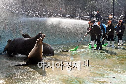 [아시아경제 이재문 기자] 완연한 초봄날씨를 보인 24일 오전 과천 서울동물원에서 직원들이 겨우 내 찌든 때로 얼룩진 바다사자들의 공간을 물로 깨끗이 청소하고 있다.