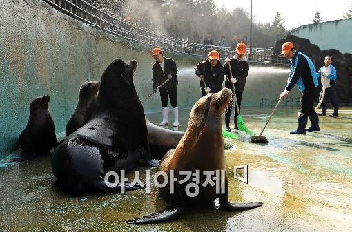 [아시아경제 이재문 기자] 완연한 초봄날씨를 보인 24일 오전 과천 서울동물원에서 직원들이 겨우 내 찌든 때로 얼룩진 바다사자들의 공간을 물로 깨끗이 청소하고 있다.