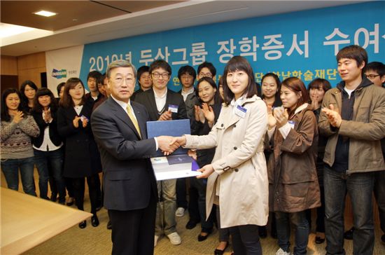 [아시아경제 채명석 기자] 두산그룹 연강재단(이사장 박용현)은 25일 서울 을지로 6가 두산타워에서 ‘2010년 두산그룹 장학증서 수여식’을 갖고 장학생으로 선발된 370명의 학생들에게 총 11억원의 장학금과 기념품을 전달했다.