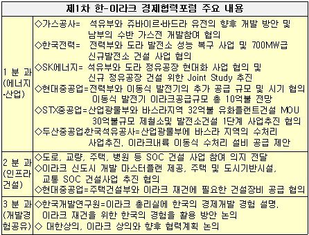 이번 포럼에서 논의된 협력방안으로는 에너지·산업부문에서 한국가스공사는 이라크 석유부와 가스공사가 지분을 참여한 쥬바이르·바드라 유전의 향후 개발 방안과 남부의 수반 가스전 개발에 참여하는 방안을 협의했다. 수반가스(Associated gas)는 유전의 상층부에 존재하는 가스로서 가스 생산시설이 없는 경우 원유와 같이 생산되는 가스는 일반적으로 소각 처리된다. 이라크 남부 유전에서 발생하는 대부분의 수반가스는 연간 430∼650만t 소각처리 되고 있다. 한국전력의 경우 이라크 전력부와 바그다드 인근 도라 발전소 성능 복구 사업과 700MW급 신규 발전소 건설 사업을 협의했다.