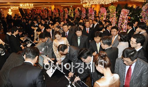 [아시아경제 이재문 기자] 25일 저녁 서울 소공동 롯데호텔에서 열린 아시아경제 신사옥 개관기념 리셉션에 참석한 참석자들이 전자 방명록에 서명하고 있다.
