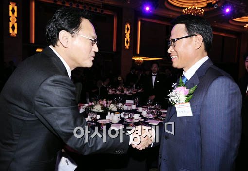 [아시아경제 윤동주 기자] 25일 오후 서울 중구 소공동 롯데호텔에서 열린 아시아경제 신문 신사옥 개관기념 리셉션에서 유인촌 문화체육관광부 장관(왼쪽)과 임영욱 아시아미디어그룹 회장이 인사를 나누고 있다.