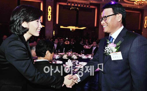 [아시아경제 윤동주 기자] 25일 오후 서울 중구 소공동 롯데호텔에서 열린 아시아경제 신문 신사옥 개관기념 리셉션에 참석한 나경원 국회의원(왼쪽)이 임영욱 아시아미디어그룹 회장과 인사를 나누고 있다.