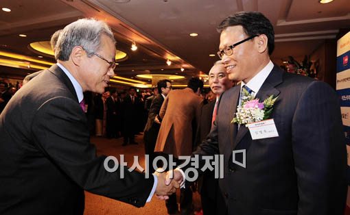 [아시아경제 윤동주 기자] 25일 오후 서울 중구 소공동 롯데호텔에서 열린 아시아경제 신문 신사옥 개관기념 리셉션에 참석한 황건호 한국금융투자협회 회장(왼쪽)이 임영욱 아시아미디어그룹 회장과 인사를 나누고 있다.