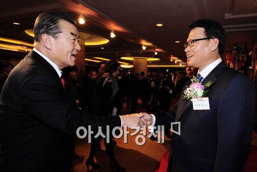 [아시아경제 윤동주 기자] 25일 오후 서울 중구 소공동 롯데호텔에서 열린 아시아경제 신문 신사옥 개관기념 리셉션에 참석한 이기수 고려대학교 총장(왼쪽)이 임영욱 아시아미디어그룹 회장과 인사를 나누고 있다.