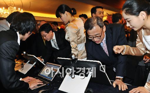 [아시아경제 이재문 기자] 25일 저녁 서울 소공동 롯데호텔에서 열린 아시아경제 신사옥 개관기념 리셉션에 참석한 참석자들이 전자 방명록에 서명하고 있다.