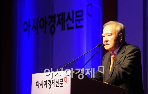 [아시아경제 윤동주 기자] 25일 오후 서울 중구 소공동 롯데호텔에서 열린 아시아경제 신문 신사옥 개관기념 리셉션에 참석한 조순 전 경제부총리가 축사를 하고 있다.