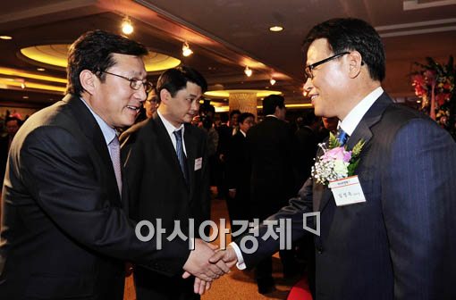 [아시아경제 윤동주 기자] 25일 오후 서울 중구 소공동 롯데호텔에서 열린 아시아경제 신문 신사옥 개관기념 리셉션에 참석한 김기문 중소기업중앙회 회장(왼쪽)이 임영욱 아시아미디어그룹 회장과 인사를 나누고 있다.