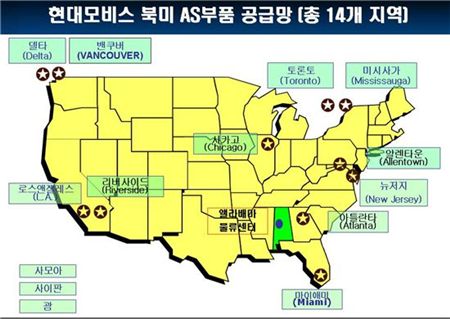 현대차의 앨라배마 공장과 기아차의 조지아 공장 등 현지에서 생산되는 차종은 앨라배마 물류센터가 A/S부품을 공급하게 된다. 27일 준공식을 마친 조지아 공장에서 생산되는 차량을 위한 A/S부품 공급을 앨라배마 물류센터에서 통합해 운영하는 것이다.