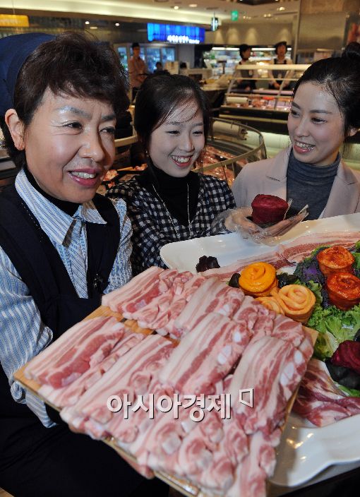 [아시아경제 이재문 기자] 롯데백화점이 삼겹살데이(3월3일)를 앞두고 28일 오전 본점 정육매장에서 무지개 빛깔 삼겹살을 선보여 고객들의 눈길을 끌고 있다. 이번에 선보인 삼겹살은 녹차와 고추장, 백련초 등으로 양념해 색깔을 냈으며 3월1일부터 4일까지 정상가 대비 20~30% 할인해 판매한다.