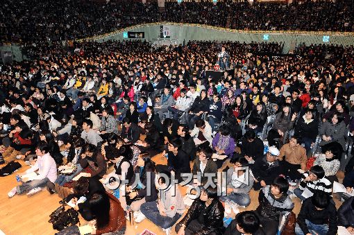 [아시아경제 이재문 기자] 28일 오후 서울 잠실 실내체육관에서 열린 메가스터디 2011 대입전략 설명회를 찾은 많은 수험생들과 학부모들이 바닥에 앉자 강사들의 학습전략을 듣고 있다.