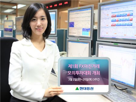 [아시아경제 이솔 기자]현대증권(대표이사 최경수)이 2일부터 오는 20일까지 3주에 걸쳐 제1차 FX마진거래 모의투자대회를 개최한다고 밝혔다.