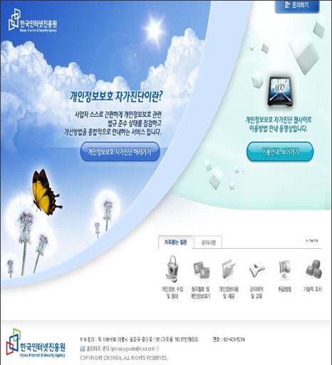 자가진단 웹사이트는 개인정보보호 법률 지식이 없어 웹사이트 운영에 어려움을 겪고 있는 중소규모 인터넷 사업자를 위해 마련됐다. 인터넷에서 개인정보의 수집 이용 관리 폐기 등 일련의 개인정보 취급과정에서 법규준수 여부를 스스로 진단해 미비사항을 파악하고 적절한 개선방안을 확인할 수 있도록 구성됐다.