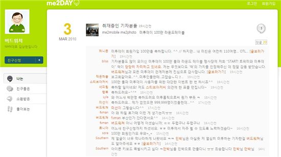 지난달 25일 서울 소공동 롯데호텔에서 열린 아시아경제신문 신사옥 개관기념 리셉션에 참석한 김 사장은 자리에 앉자마자 아이폰을 꺼내 들었다. 자신의 일상을 그대로 미투데이에 담기 위해서다. 김 사장은 같은 테이블에 앉은 여배우 한채영씨에게 조심스레 "미투데이 한번 해보시죠"라고 권했다면서 이런 내용을 실시간으로 미투데이에 올렸다.