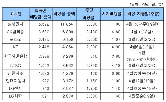 [아시아경제 정선영 기자]이번달 주주총회 일정이 잡혀있는 상위권 외국인 배당 기업의 배당금 지급일자가 대부분 4월로 넘어갈 전망이다.
