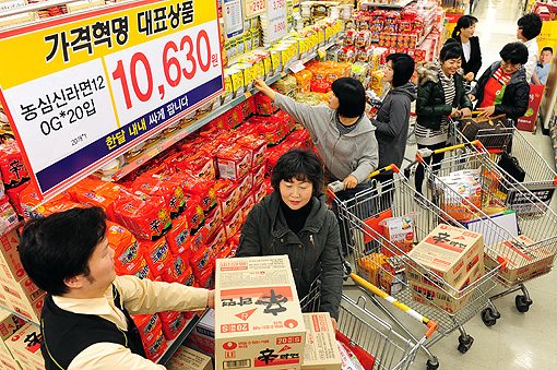 8일 업계에 따르면 이마트, 홈플러스, 롯데마트 등 대형마트 3사가 지난 4일부터 신라면과 삼양라면 값을 할인판매(9~20%)하면서 관련 제품이 행사매장에서 잇따라 품절되는 사태를 빚고 있다.