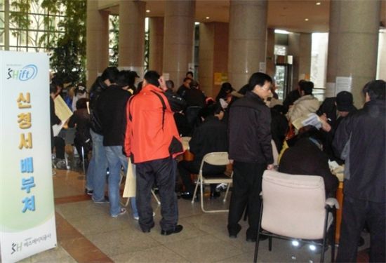 이날 현장 접수는 오전 10시부터지만 시작 1시간 30분전부터 예비 청약자들이 몰리기 시작해 접수를 시작할 무렵에는 이들이 1층 로비를 거의 점거하다시피 했다. 출근을 하는 SH공사 직원들도 1층 로비에 몰려 있는 사람들을 보며 의아해하는 모습이다.
