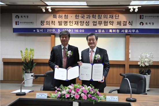 [아시아경제 왕성상 기자] 특허청과 한국과학창의재단은 10일 오후 특허청 서울사무소 5층 대회의실에서 열린 업무협약(MOU)을 맺었다.
