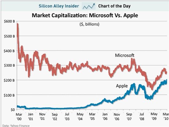 10일(현지시간) 나스닥 지수는 사상 최고치의 절반에도 못 미치는 2358.95로 거래를 마쳤지만 나흘 연속 연고점 랠리를 이어갔다. 시가총액 2000억달러를 넘어선 애플 역시 나흘 연속 사상 최고치를 갈아치우며 나스닥과 행보를 같이 했다. 월가에서는 애플이 마이크로소프트마저 따라잡을수 있을지에 점점 관심이 커지는 모습이다.