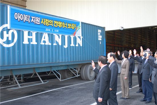 한진이 11일 인천항만공사(IPA)가 '사랑의 컨테이너 보내기' 캠페인을 실시해 기탁받은 구호물품의 보관, 하역과 인천 항동 물류터미널에서 인천항으로의 컨테이너 운송과 부산항까지의 연안운송을 맡았다고 밝혔다.