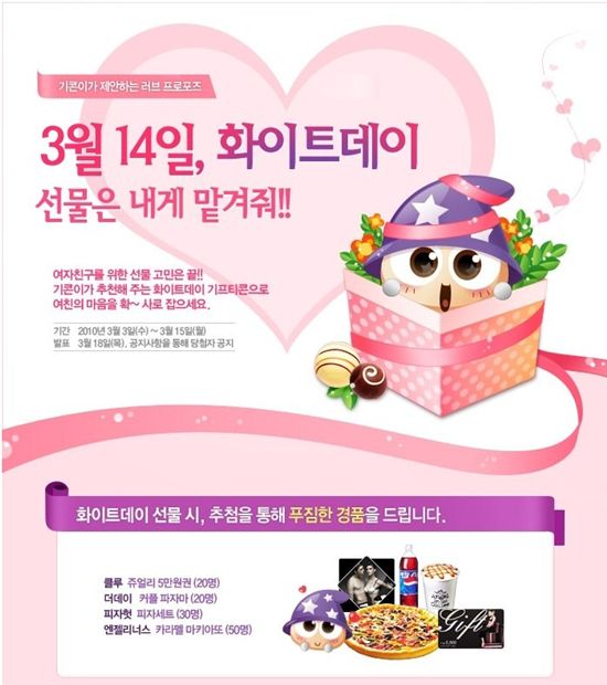 [아시아경제 김철현 기자]오는 14일 연인들의 기념일 '화이트데이'를 맞아 온라인과 모바일 등의 인터넷 공간에서 풍성한 이벤트가 마련돼 눈길을 끌고 있다.