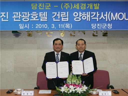 당진군과 ㈜세경개발은 11일 당진읍 시곡리 일대에 관광호텔를 짓기 위한 투자양해각서를 주고받았다.