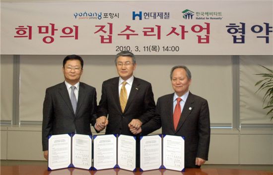 [아시아경제 채명석 기자] 현대제철은 11일 포항시청에서 박승호 포항시장, 김윤기 현대제철 부사장, 이창식 한국해비타트 회장이 참석한 가운데 포항시·한국해비타트와 ‘희망의 집수리 사업’ 협약식을 체결했다.