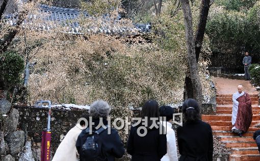 [아시아경제 이재문 기자] 법정(法頂)스님이 11일 오후 서울 성북동 길상사에서 입적한 가운데 스님의 시신이 모셔진 길상사 내 행지실(行持室) 앞에서 신도들이 행지실을 바라보고 있다.