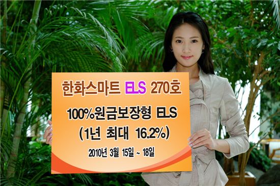 '한화스마트ELS 270호'는 KOSPI200지수를 기초자산으로 하며 최대 연 16.2% 수익이 지급되는 1년 만기 상품이다. 기초자산이 만기 시 최초 기준지수 대비 30%를 초과 상승한 적이 없으면 [만기지수상승률x 54%] 만큼의 수익이 지급되며, 투자기간 중 한 번이라도 최초 기준지수 대비 30%를 초과상승한 적이 있으면 연 5.0%로 수익이 확정된다. 또한 만기에 지수가 최초기준지수 미만으로 하락해도 투자원금의 100%를 보장하는 상품이다.