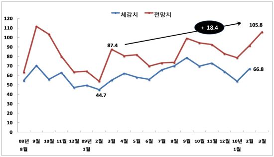 특히 M-BSI 전망치가 100을 넘어선 것은 지난 2008년 10월 이후 17개월만이다. 전년 동기 대비로는 18.4P 높아졌다. 이런 변화는 지난해 경기악화에 따른 소비자 불안심리가 올해 들어 경기안정에 대한 기대로 변화되었기 때문이라는 게 센터 측 설명이다.