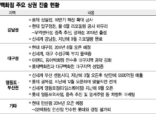 서울 강남에서는 롯데와 현대, 신세계 등 '빅3'가 올해와 내년 리모델링ㆍ증축을 앞다퉈 추진하며 강남대전을 준비하고 있다. 또 서남부 430만명을 아우르는 영등포 지역에서는 롯데와 신세계의 2파전에 현대백화점 목동점이 가세하고 있다. 부산지역은 지난해 신세계 센텀시티가 개점하면서 롯데백화점의 '아성'에 도전장을 내밀었다.