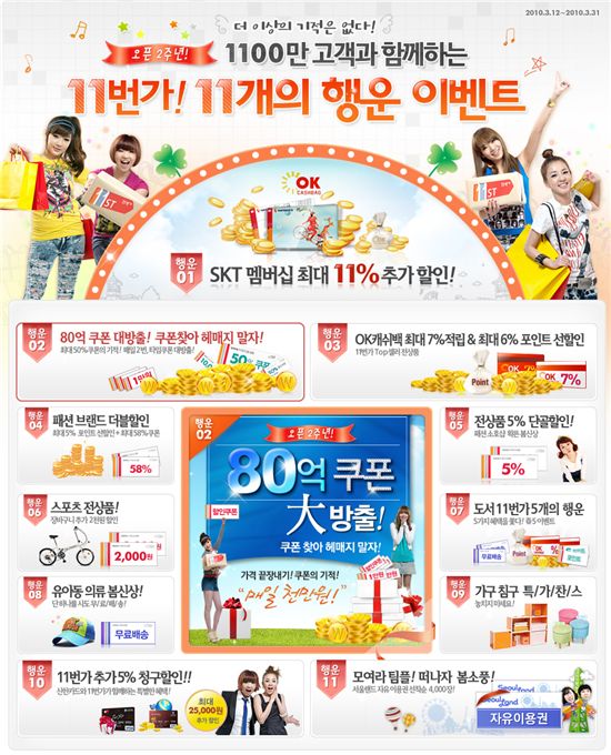 [아시아경제 최대열 기자]SK텔레콤이 운영하는 오픈마켓 11번가는 서비스 오픈 2주년과 1100만 고객 돌파를 기념해 15일부터 11가지 다양한 고객사은행사를 실시한다.